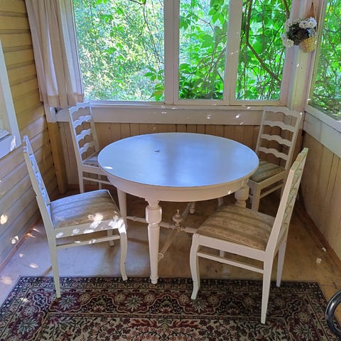 Iskun vanha ruokailuryhmä johon kuuluu 4 pinnatuolia ja jatkettava soikea ruokapöytä. Tuoleissa ja pöydän pinnassa kulumaa, mutta yleisilme on siisti ja kalusteet ovat tukevia.