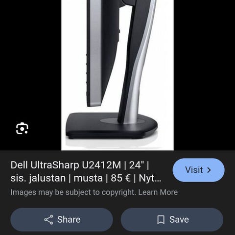 Dell 24" näyttö. Näytössä on kääntyvä ja kallistettava jalusta, jonka avulla ruudun voi asettaa sekä vaaka- että pystyasentoon. Laitteessa on useita liitäntöjä, kuten DVI-, VGA- ja komponenttiliittimet, sekä muistikortinlukija ja USB-portteja sivussa. Soveltuu esimerkiksi tietokoneen ulkoiseksi näytöksi tai monipuoliseen työpöytäkäyttöön.