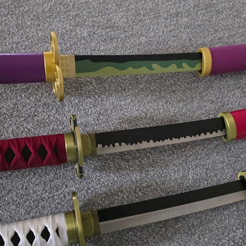 Zenitsu cosplay katana. Ulkokuori tehty muovista, itse katanaosa on maalattu ja on puusta joka on kevyt.