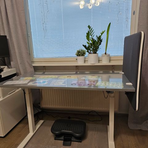 Hyväkuntoinen sähkösäätöinen työpöytä laadukkailla säädöillä. Pöydässä neljä muistipaikkaa eri korkeuksille. Pöydän alustaa on mahdollista leventää jos haluaa vaihtaa leveämmän pöytälevyn.