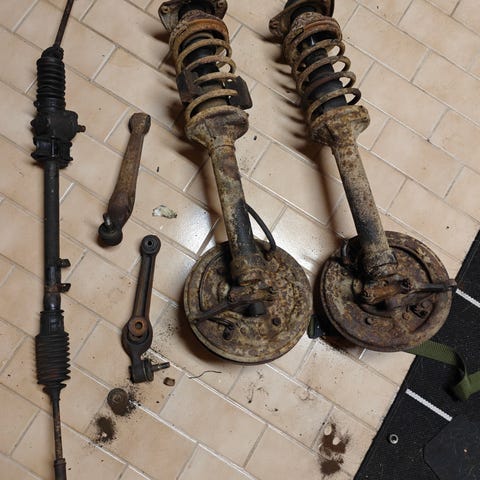 Ford Escort auton varaosia, johon kuuluu etuvalot, takavalot, mittaristo ja etupuskuri.
