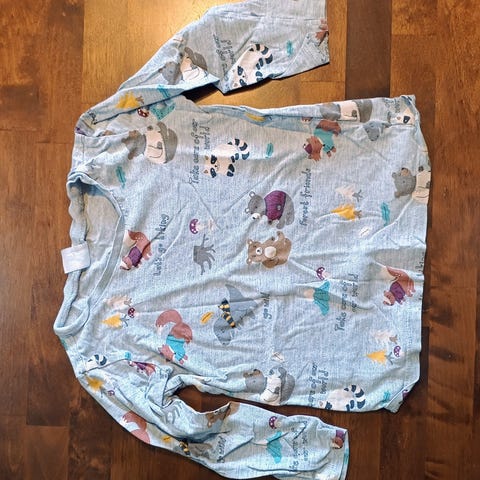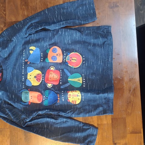 Tummansininen pitkähihainen paita, meleerattu kangas ja värikkäät eläinkuviot edessä (lintu, koira, kissa, jänis ym. ympyröissä). Tu-merkki, 63% puuvilla / 37% polyesteri. Siisti ja hyvässä kunnossa. Nouto Jätkäsaaresta.