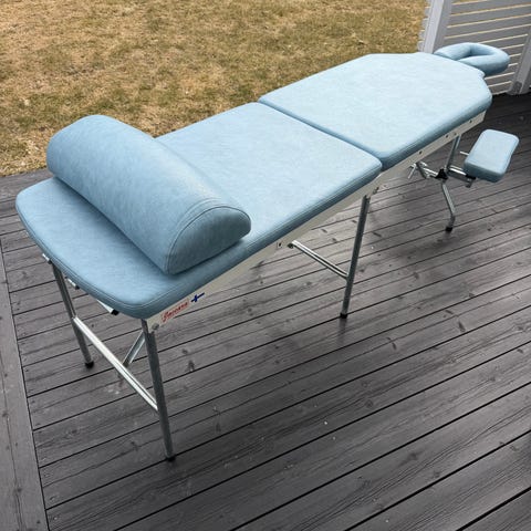 Sopii myös ammattikäyttöön, uutta vastaava, virheetön. Mukana matkapussi pyörillä. Kotimainen ja tukeva Jaccara hieromapöytä, myydään tarpeettomana. Pituus 160cm, leveys 52cm, korkeus 68cm, niskatuen pituus 30cm ja irrotettavien käsitukien pituus 40cm. Mahdollinen kuljetus Pirkanmaalle sovitaan erikseen.
