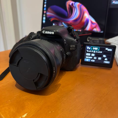 Canon EOS 600D digitaalinen kamera musta. Kamerassa on kääntyvä näyttö ja se soveltuu valokuvaukseen sekä videokuvaukseen. Kameran mukana tulee Canon EF-S 18-55mm objektiivi, etulinssinsuoja, akkulaturi, kamerahihna, kameralaukku ja käyttöopas. Tarkemmat tekniset tiedot, kuten tarkka megapikselimäärä, ISO-alue ja videon tarkkuus, löytyvät Canon EOS 600D -mallin yleisistä teknisistä tiedoista.