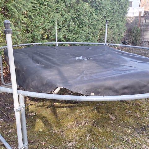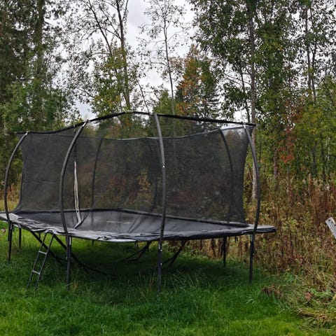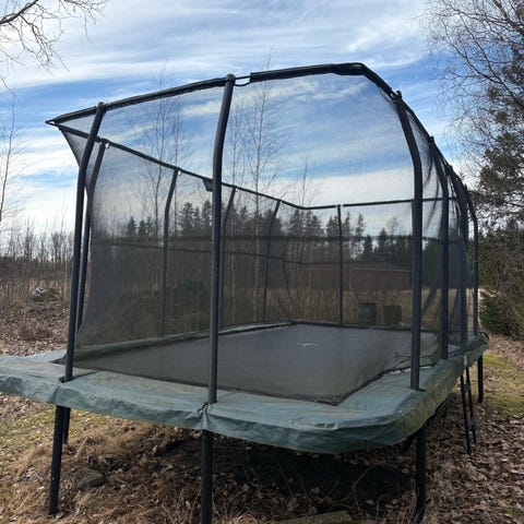 Explorer Rectangular 460 Petrol soikea trampoliini turvaverkolla.