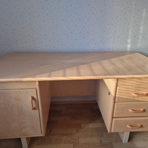 Kirjoituspöytä laatikostolla. Pöydässä on ruskea puuviilu tai puumainen pinta ja toisella sivulla neljä vetolaatikkoa metallinvärisillä vetimillä. Toisella sivulla on avoin jalkatila. Sopii esimerkiksi työpöydäksi koululaiselle tai opiskelutilaan.