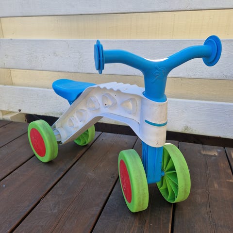 Jupiter-merkkinen potkupyörä/tasapainopyörä neljällä pyörällä. Vihreä metallinen runko, mustat kumipyörät vihreillä vanteilla, musta pehmustettu satula ja pehmustetut kädensijat. Sopii n. 1-3-vuotiaille. Hyvässä kunnossa, pieniä käytön jälkiä. Nouto Jätkäsaaresta.