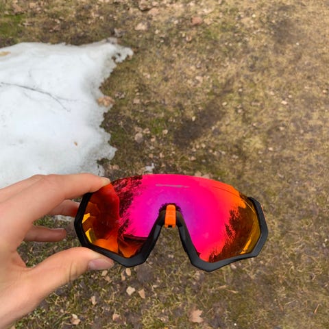 Näyttävän keltaiset Oakley Frogskins aurinkolasit. Linsseissä pieniä naarmuja ja toisessa linssissä pienenpieni jälki.