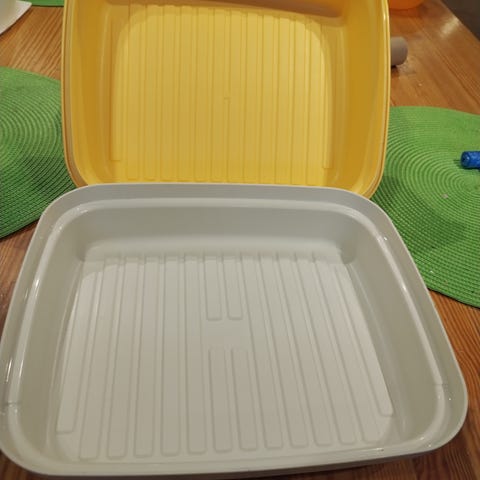 Tupperwaren leipälaatikko, sininen sipulileikkuri ja käyttämätön punainen sipulileikkuri