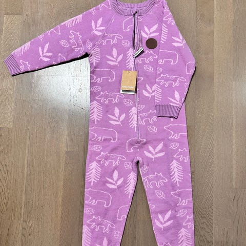 Jonathan merinovilla haalari, koko 100, violetti. Materiaalina merinovilla 80% ja polyester 20%. Haalarissa on pitkät hihat ja lahkeet sekä edessä vetoketju kauluksesta lahkeeseen.
