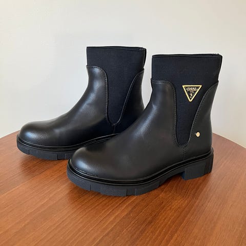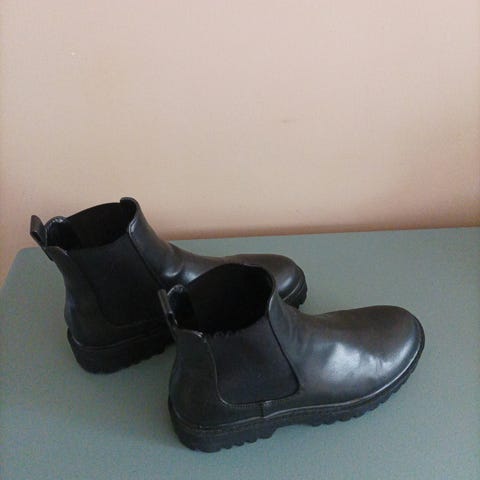 Nilkkapituiset saappaat koossa 43. Kengissä on käärmekuvioinen pinta ja matala korko. Sivussa on vetoketju pukemisen helpottamiseksi. Pohjat ovat tasaiset ja soveltuvat arkikäyttöön. Materiaali vaikuttaa olevan synteettinen, tarkka koostumus ei ole tiedossa.