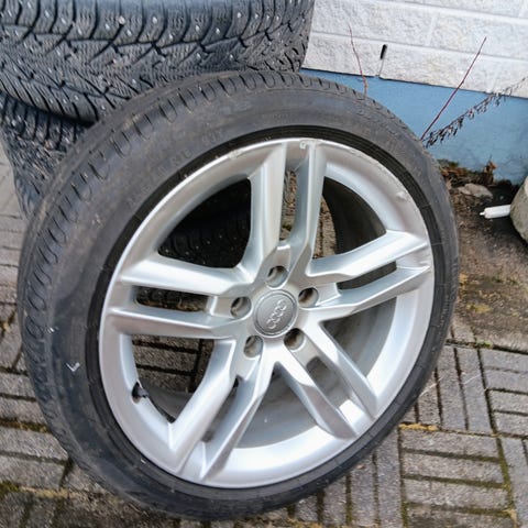 Renkaina kahdet 245/45/18, joissa ei ole juurikaan pintaa jaljella. Ja kahdet 245/40/18, joissa on vielä hieman pintaa jaljellä.