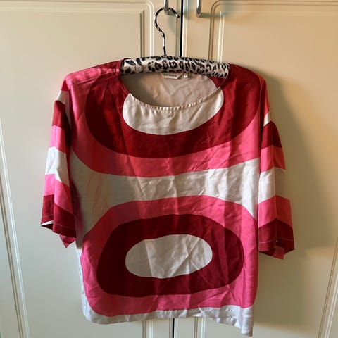Marimekko mekko, koko M (reilu kiko!) Materiaalina silkki. Mekossa on kirjava kuosi, jossa on kuvioituja hevosia ja pyöreitä muotoja tummalla pohjalla. Upea juhlamekko! Mekkoa ei ole kertaakaan pesty, mutta pesetän pesulassa ennen myyntiä. Huolto- ja pesuohjeet löytyvät vaatteen pesulapusta.