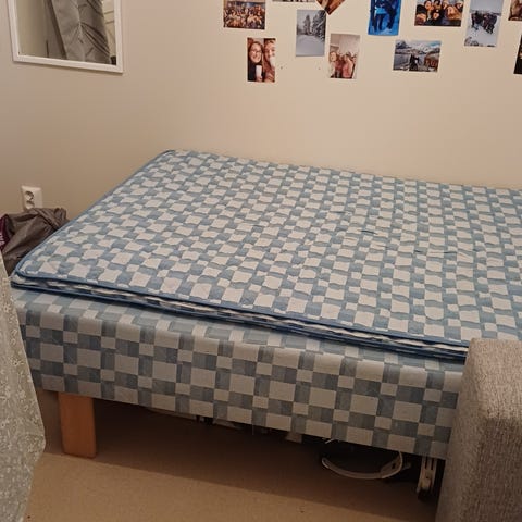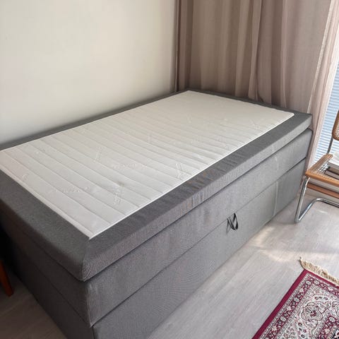 Sotkan 120 cm runkopatja harmaalla verhoilulla. Sängyssä on erillinen petauspatja, patjansuojus ja metallijalat. Sopii yhden hengen sängyksi pieneen kotiin tai vierashuoneeseen.