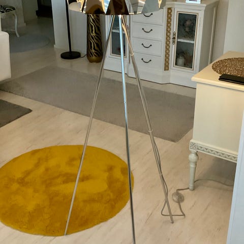 Hyvässä kunnossa oleva kolmijalkainen lattiavalaisin. Lampun varjostimessa pari haaleaa tahraa, ks. kuvat.