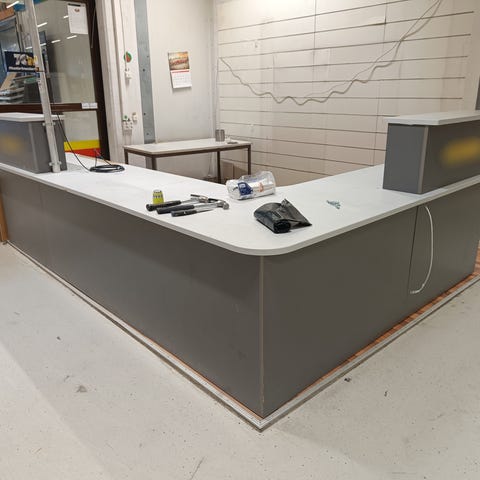 Valkoinen kaareva myyntitiski hyllyillä