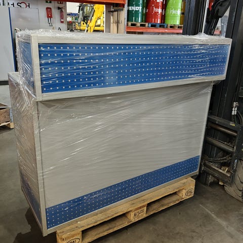 Valkoinen kaareva myyntitiski, jonka etupuolella on pystysuuntaiset listat ja takapuolella avointa hyllytilaa. Tiskissä on useita hyllyjä tavaroiden säilytykseen ja esillepanoon. Sopii esimerkiksi myymälään, messuosastolle tai vastaanottotiskiksi. Materiaalina maalattu puu ja levyrakenne, sokkeliosa on erillinen ja etuosa kaareva. Tukeva ja painava.