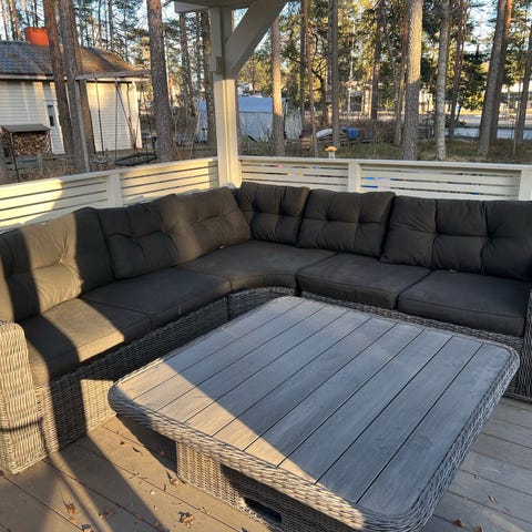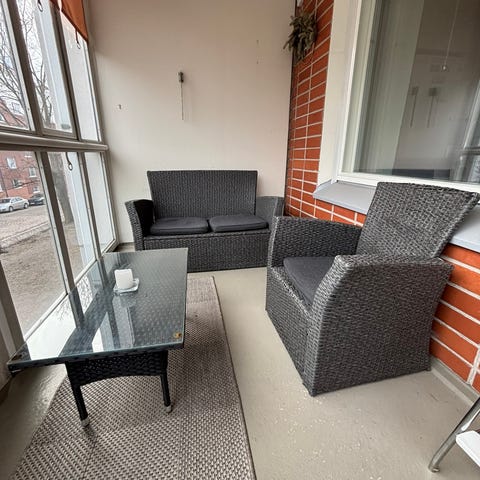 Kaksipaikkainen sohva ja kaksi nojatuolia, rungot ja rottinkiosat hyvät, pehmusteissa muutama pieni reikä. Tyynyjä kääntelemällä saa piiloon tai sitten pikku korjausompeleet tekemällä.
