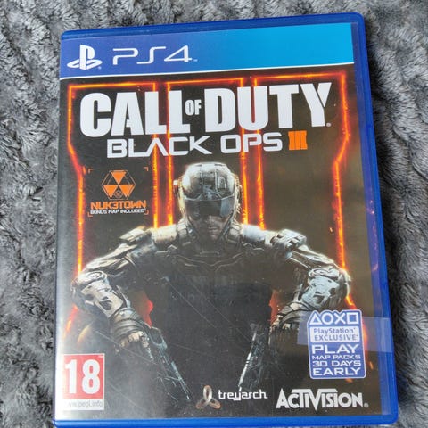 Activision Call of Duty Black Ops III on PlayStation 4 -peli. Kyseessä on ensimmäisen persoonan ammuntapeli, joka sisältää kampanjatilaa, moninpelitilan sekä zombietilan. Ikäraja on PEGI 18.