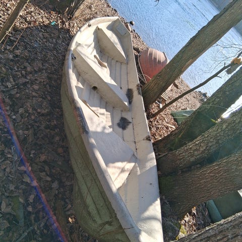 Siitä suvin vene pikku laitolla vesille. Seisonut pari vuotta moottorin rikkoonnuttua. Penkin alle jäänyt vettä, jonka seurauksena pohjaan tullut 20sentin halkeama.