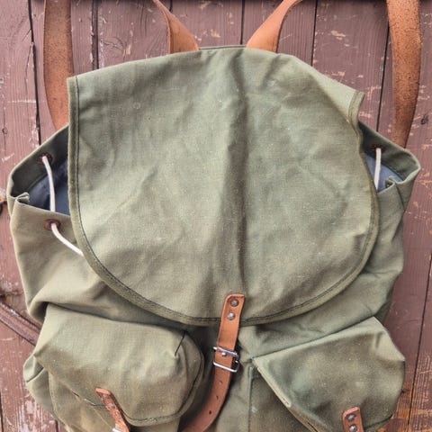 Vihreä vintage kangasreppu, jossa nahkaiset olkahihnat ja taskujen sulkijat. Olkahihnat ovat säädettävät.