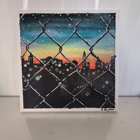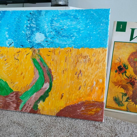 Maisemamaalaus, jossa on kuvattuna punakattoinen valkoinen talo peltoaukean laidalla ja taustalla puustoa sekä laaja taivas. Maalaus on toteutettu akryyliväreillä kankaalle pystysuuntaiselle pohjalle. Värimaailma koostuu keltaisista, vihreistä, sinertävistä ja punaisista sävyistä. Sopii käytettäväksi sisustuselementtinä esimerkiksi olohuoneessa, makuuhuoneessa tai työtilassa.