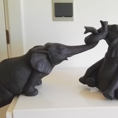 Tässä on kaksi leikkisää elefanttia, jotka on tehty resiinistä. Toisen elefantin täytyy parhaansa mukaan pitää toisen kiinni syvyydestä. Se antaa erittäin kauniin vaikutelman olohuoneessa. Mittasuhteet ovat seuraavat (kaksi yhdessä, noin):Korkeus: 25 cmLeveys: 60 cmErä pakataan huolellisesti ja lähetetään rekisteröidyllä postilla.