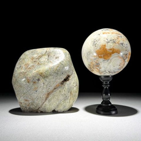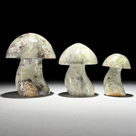 Upea sarja kolmesta sieniä muistuttavasta onyx-kivestä. Onyx on chalcedonin eräänlainen mikrokrystalline kvartsin muodostuma. Onyxillä on suorat, melkein rinnakkaiset väriraidat tai kerrokset, joiden ansiosta taitavat jalokivenleikkaajat voivat poistaa materiaalia ja luoda cameoja ja intaglioja poikkeuksellisen syvä- ja kontrastivaikutelman.Onyxilla on tyypillisesti musta pohja, jossa on valkoisia tai värillisiä raidat. Väriä peittävät raidat voivat vaihdella ruskean, punaisen, oranssin, keltaisen, vihreän, sinisen ja violetin sävyissä.Noin mitat Korkeus 1: 10,5 cm Leveys 1: 7,5 cmKorkeus 2: 8,6 cm Leveys 2: 6,2 cmKorkeus 3: 6,3 cm Leveys 3: 4,1 cmVAROITUKSET: > Huomioithan, että nämä kuvat on otettu hämärässä studiotilassa; värit voivat vaihdella ympäristön mukaan.> MAINITTU PAINO SISÄLTÄÄ PAKKAUSMATERIAALIN.LÄHETYS- Tavara lähetetään seurattavalla tilauskoodilla DHL Parcelin, DPD:n tai PostNL:n kautta. Seuranta päivittyy Catawiki-tilaukseen, kun pakettisi on jätetty lähetykseen.- Ole hyvä ja tarkista säännöllisesti, ettei pakettisi palautuisi meille; tällöin ostaja vastaa toisen lähetyksen kustannuksista.- Espanjaan ja Portugaliin seurannan osalta käytä tätä linkkiä ja lisää Catawiki-tilauksesi seurantanumerohttps://clientesparcel.dhl.es/LiveTracking/HomeEMME YHDISTÄ LÄHETYSTÄ!!!Jos sinulla on kysyttävää pakettisi liittyen, ota yhteyttä Catawiki-viestipalvelun kautta. Yritämme vastata 3 työpäivän kuluessa.