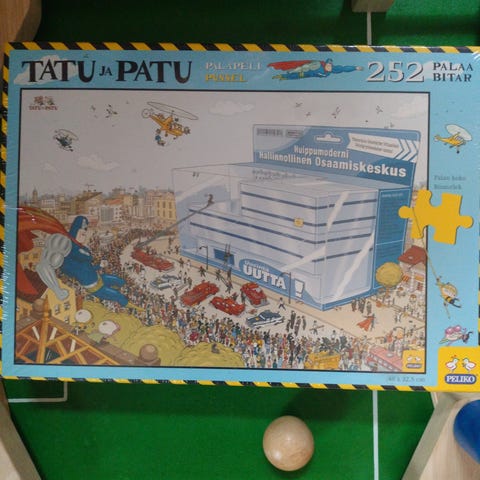 Palapeli ja tikkupalapeli, kaikki palat tallella, yhtä palaa pureskeltu, muutoin hyvässä kunnossa.