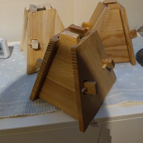 Muutaman kerran aikanaan käytetty ja sittemmin kaappiin unohtunut puinen muotti pashalle. Kokopuiset osat ”elävät” kosteuden mukaan, nyt kuivana näyttää vinkuralle, mutta hyvin toimi.