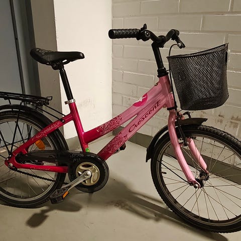 Crescent Edda lastenpyörä 20" (50 cm). Väritys on pinkki koristekuvioilla satulla, rungolla sekä ketjusuojalla. Pyörässä on takatavarateline, lokasuojat, soittokello sekä jälkä- jä käsijarru. Ei ole nopeusvaihtoja. Hyvässä kunnossa.