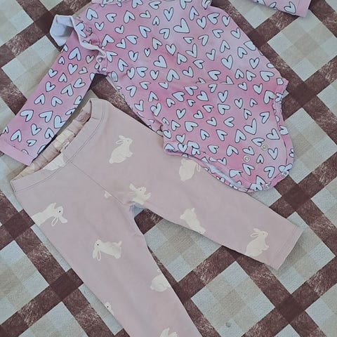 Lasten vaatesetti tytöille, koko 80 - 86. Settiin kuuluu useita erilaisia mekkoja ja yksi pitkähihainen body. Vaatteissa on monivärisiä ja kukallisia kuoseja sekä erilaisia malleja, esimerkiksi hihattomia ja lyhythihaisia mekkoja. Sopii noin 80 - 86 cm pitkälle lapselle. Materiaali vaikuttaa pääosin pehmeältä ja arkeen sopivalta kangasmateriaalilta. Kirjavat värit ja kuosit.