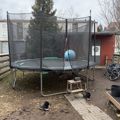 Hyväkuntoinen, talvisin sisätiloissa säilytetty trampoliini tarjolla. Suojaverkko uusittu parisen vuotta sitten. Jousien päälle tuleva suojus kaipaisi ehkä uusintaa parin kesän jälkeen. Varaosia saatavilla Biltemasta tähän 396cm halkaisijaltaan olevaan malliin. Kaikki osat tallessa, ja suojaverkon kiinnikkeitä hukattavaksikin asti.