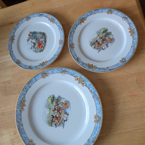 Kaksi hienoa pääsiäisaiheista isoa ruokalautasta, halkaisija 27cm. Toisen lautasen lasitteen alla näkyy kirkkaassa valossa pari virhettä, kuin pieniä poreita. Ei kuitenkaan mitenkään haittaa käyttöä. Muuten täysin ehjät ja siistit.