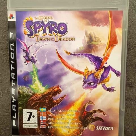 Playstation 3 The Legend of Spyro Dawn of the Dragon -peli. Toimintaseikkailupeli, jossa ohjataan Spyro-lohikäärmettä fantasiamaailmassa. Pelikotelon kannessa PEGI 7 -ikäraja ja useiden kielten tuki. Levy ja kotelo Playstation 3 -järjestelmälle.