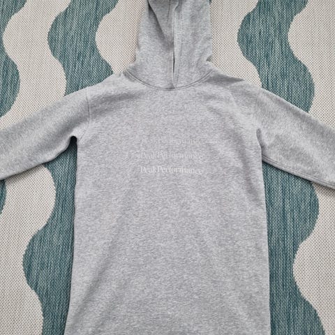Myydään uudenveroinen Peak Performance collegetunika, koko 140cm. Väri harmaa. Pitkä malli, huppu, hihansuissa resorit.