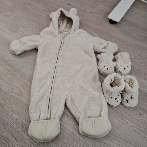 Pehmeä karvavuori. Kääntöhihat ja puntit. Kokoa 56 mutta menee pidemmän aikaa. Hyvä näille keleille vaunuihin tai turvakaulakoon. Tahraton, pinta on nukkaantunut mutta nukanpoistajalla saa vielä uudenveroiseksi.