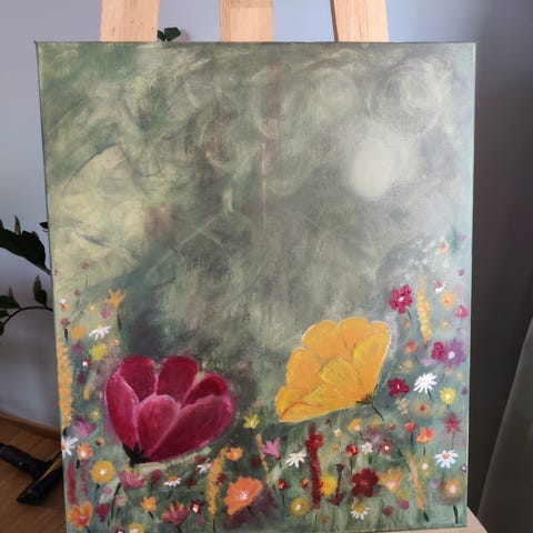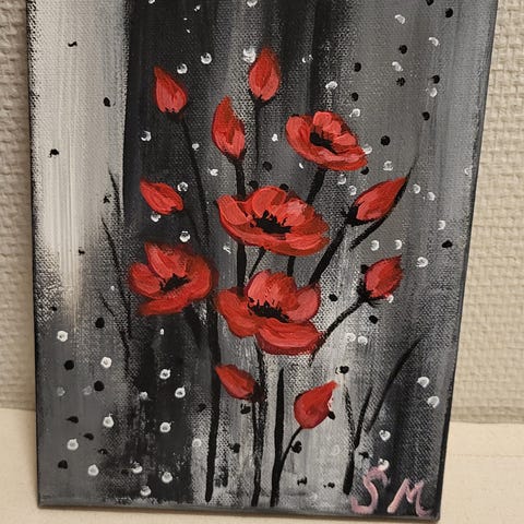 Kukkamaalaus akryyliväreillä kankaalle. Teoksessa on punaisia ja valkoisia kukkia vihreine lehtineen vaalealla taustalla. Sopii seinäkoristeeksi esimerkiksi olohuoneeseen, makuuhuoneeseen tai työtilaan. Maalaus on tehty valmiille kankaalle, joka voidaan ripustaa seinälle kehystettynä tai ilman kehyksiä ostajan valinnan mukaan. Koko 30 x 40 cm.