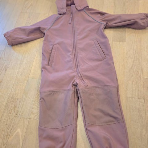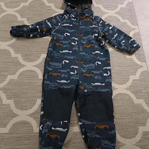 Siistikuntoinen Name it -softshellhaalari seuraavalle. Pepussa eikä polvissa juurikaan kulumaa. Etupuolella muutama hento jälki, ehkä kynää. Tuskin näkyy käytössä, ei juurikaan erotu haalarin kuosista. Hihan-ja lahkeensuut ehjät. Jalkalenksut vaihdettu Reiman lenksuihin.