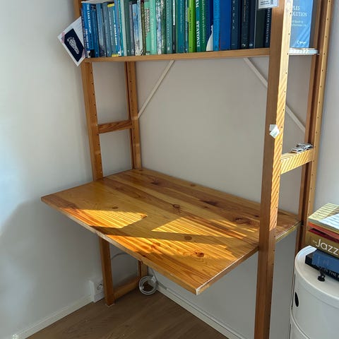 Lundian osa - pöytätaso, materiaali lakattu mänty. Sopii Lundia-hyllyjärjestelmän kokonaisuuden täydentämiseen. Kuvissa näkyy yksityiskohtia puupinnoista ja kiinnitysrei’istä. Alla ollut joskus näppäimistö. Vain nouto.