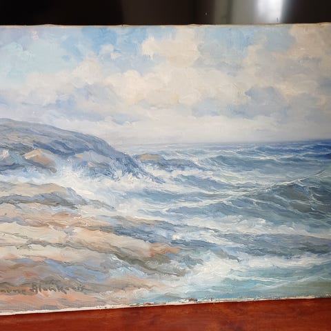 Aarre Alanko öljymaalaus, jossa esitetty järvimaisema kallioineen ja mäntyineen. Teos on signeerattu etualalla. Maalaus on perinteisessä suorakaiteen muotoisessa muodossa ja kiinnitetty näyttäviin kullattuihin, koristeellisiin puukehyksiin. Koko 90x68 cm ja vain nouto Raisiosta