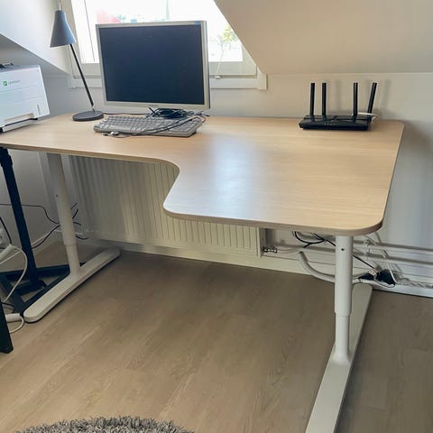 Myydään pienemmän pöydän alta pois. Korkeussäädettävä jaloista. Pöydän alla johto"kouru". Pöytä kuvassa matalimmassa asennossa. Korkeussäädettävä.