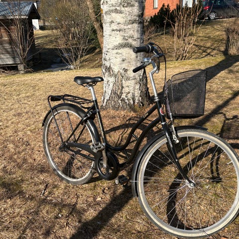 Insera kaupunkipyörä naisten rungolla, koko M. Pyörässä on 28" (700c) renkaat ja matala, helppokulkuinen runko. Varusteluun kuuluu etukori, takatavarateline, seisontatuki sekä perinteinen jalkajarru. Ohjaustanko on pysty ajoasentoon soveltuva ja satula on perusmallinen. Soveltuu arkiajoon ja asiointimatkoille kaupunkiympäristössä. Pyörä on ollut käytössä ja käytön jälkeä löytyy, mutta ihan toimiva menopeli. Renkaat kaipaavat ilmaa talven jälkeen. Nouto Outokummusta.