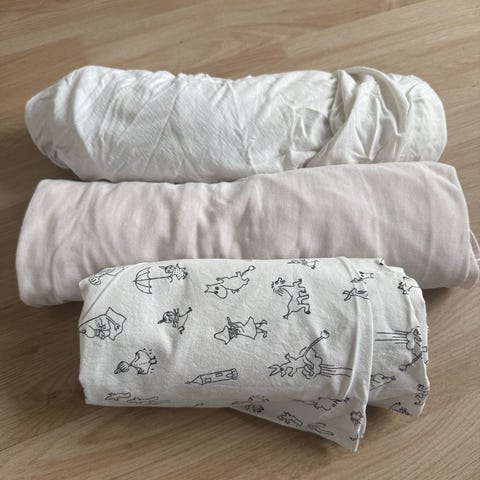 3 aluslakanaa pinnasänkyyn (koko n.60x120cm), joista yksi muotoonommeltu.