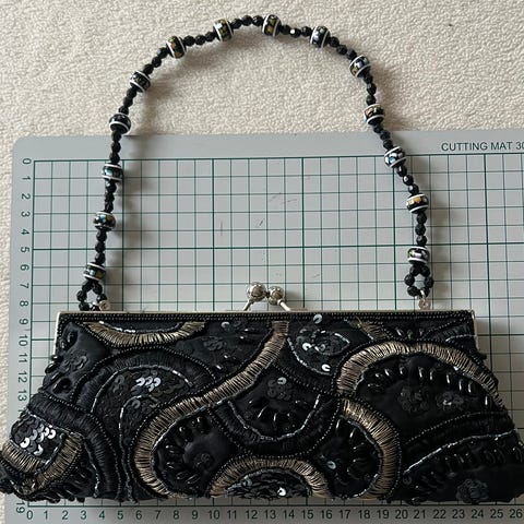 Uniikki, hieno, ylellinen ja juhlava! Musta juhlalaukku / iltalaukku. Satiininen kangas materiaali. Samaan aikaan sekä siro, että melko suuren kokonsa ansiosta myös tilava. Laukku suljetaan vetoketjulla. Takapuolella vetoketjutasku. Sisäpuolella taskuja. Katsothan kuvista laukun etuosan upeat yksityiskohdat. Kerrassaan hieno laukku-kaunokainen keikkumaan käsiisi juhliin tai illanviettoon. 💃🏼👜