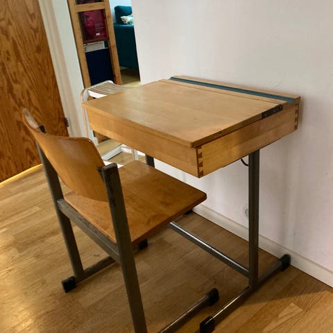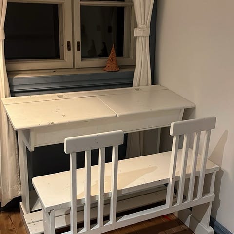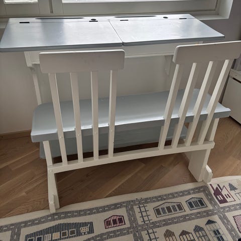 lasten pulpetti penkillä. Pöydässä on sininen kansi ja istuimessa sekä rungossa punaiset osat. Pöytä ja penkki muodostavat yhtenäisen kalusteen, joka soveltuu lapsen työskentelyyn ja leikkeihin sisätiloissa. Materiaali vaikuttaa olevan puuta tai puupohjaista levyä maalipinnalla. Kalusteessa on kiinteä selkänojallinen penkki ja tasainen työskentelytaso.