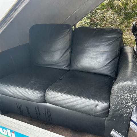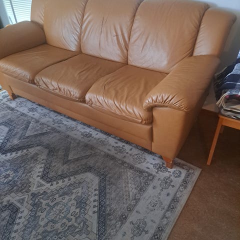 Annetaan kulunut tammirunkoinen nahkapällysteinen kulmasohva, joka koostuu kolmesta osasta. Sohvassa on viisi säilytyslaatikkoa rungon alaosassa. Noudettava Kastellista omat kantajat.