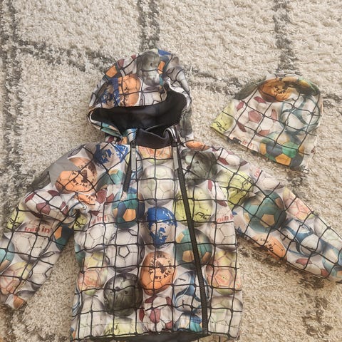 Myydään erittäin hyväkuntoinen Molo Hopla välikausitakki, koko 110. Kuosi: Footballs. Ostettu uutena, yhdellä käytetty satunnaisesti. Erinomainen kunto.