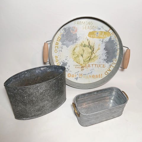 Myydään vanha sinkkipeltinen setti, johon kuuluu iso aluslautanen ja 6 kpl pieniä ruukkuja. Näitä on käytetty taimikasvatuksessa, ja jälkiä näkyy, mutta soveltuvat yhä tarkoitukseensa oikein hyvin. Lautasen halkaisija on 29 cm, ruukkujen halkaisija 7 cm ja korkeus 6,6 cm.