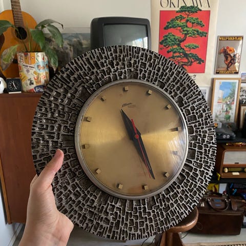 🕰️ Atlanta Electric-seinäkello 1960-luvulta. Valmistettu tiikistä, messingistä ja lasista Länsi-Saksassa.